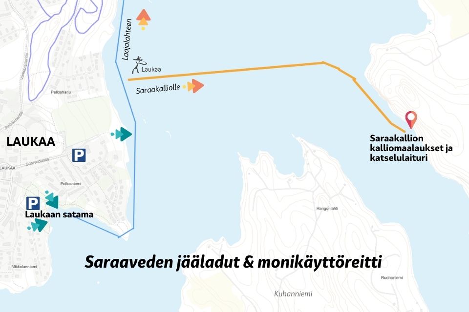 Saraakallion kalliomaalauksille johtavaa monikäyttöreittiä voi kulkea hiihtäen, kävellen, pyöräillen ja lumikengillä. Reitille pääset Laukaan sataman uimarannalta tai Laukaan hautausmaan viereistä polkua rantaan. Matkaa Laukaan satamasta Saraakalliolle on noin 3 km tai Laukan hautausmaan vierestä Saraaveden rannasta noin 2 km. Auton voi jättää parkkiin esimerkiksi Laukaan satamaan.