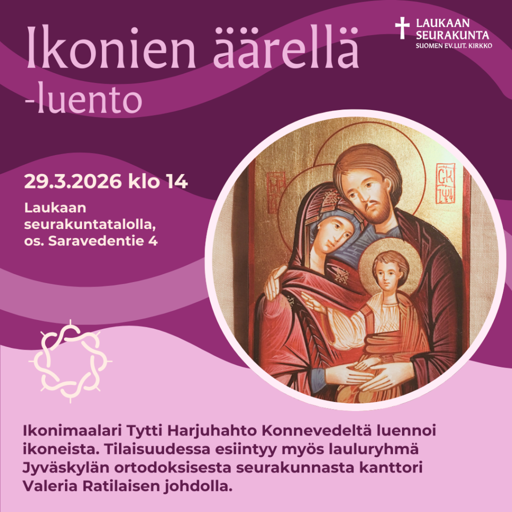 Ikonimaalari Tytti Harjuhahto Konnevedeltä luennoi ikoneista. Tilaisuudessa esiintyy myös lauluryhmä Jyväskylän ortodoksisesta seurakunnasta kanttori Valeria Ratilaisen johdolla.