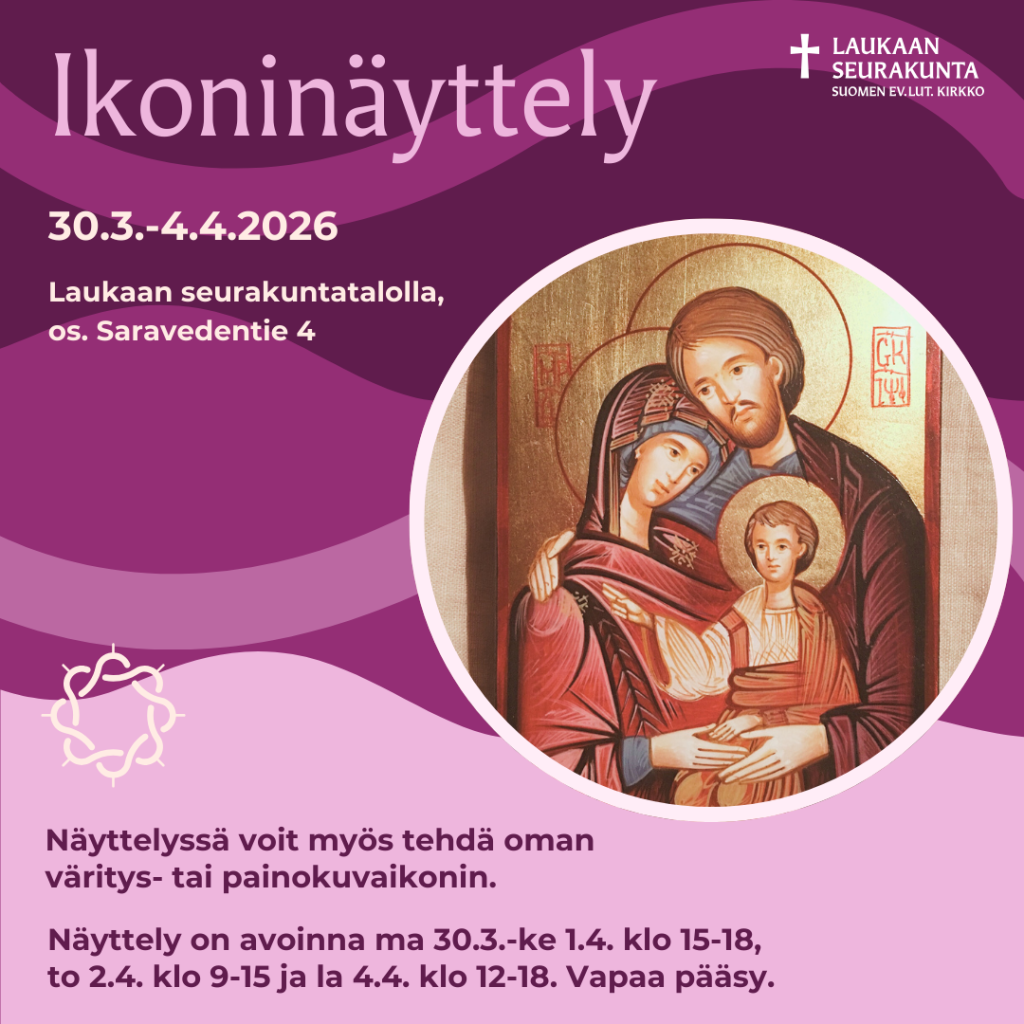 Laukaan seurakunnan kevään kohokohta on hiljaisella viikolla 30.3.-4.4.2026 Laukaan seurakuntatalolla järjestettävä ikoninäyttely. Näyttelyssä on esillä seurakuntalaisten ja työntekijöiden omistamia ikoneita ja edellisenä viikonloppuna helmi-ikonipajassa tehtäviä ikoneita. Näyttelyssä Voi myös itse tehdä väritys- tai painokuvaikonin.