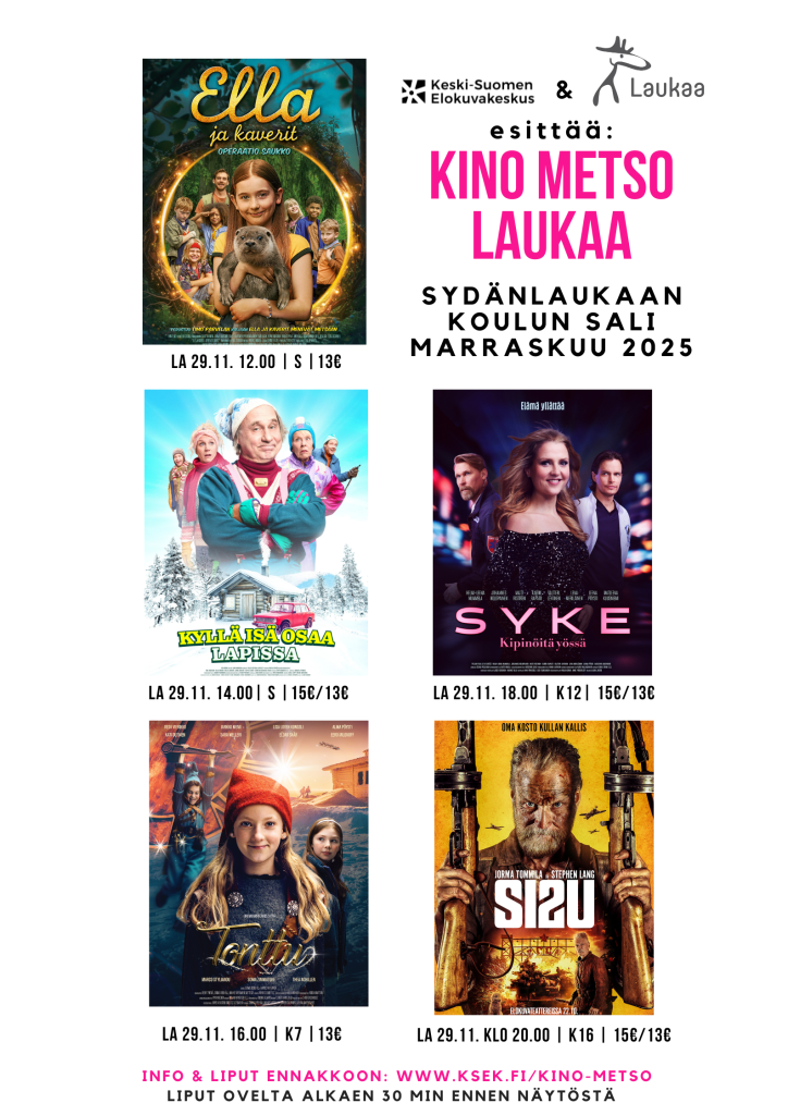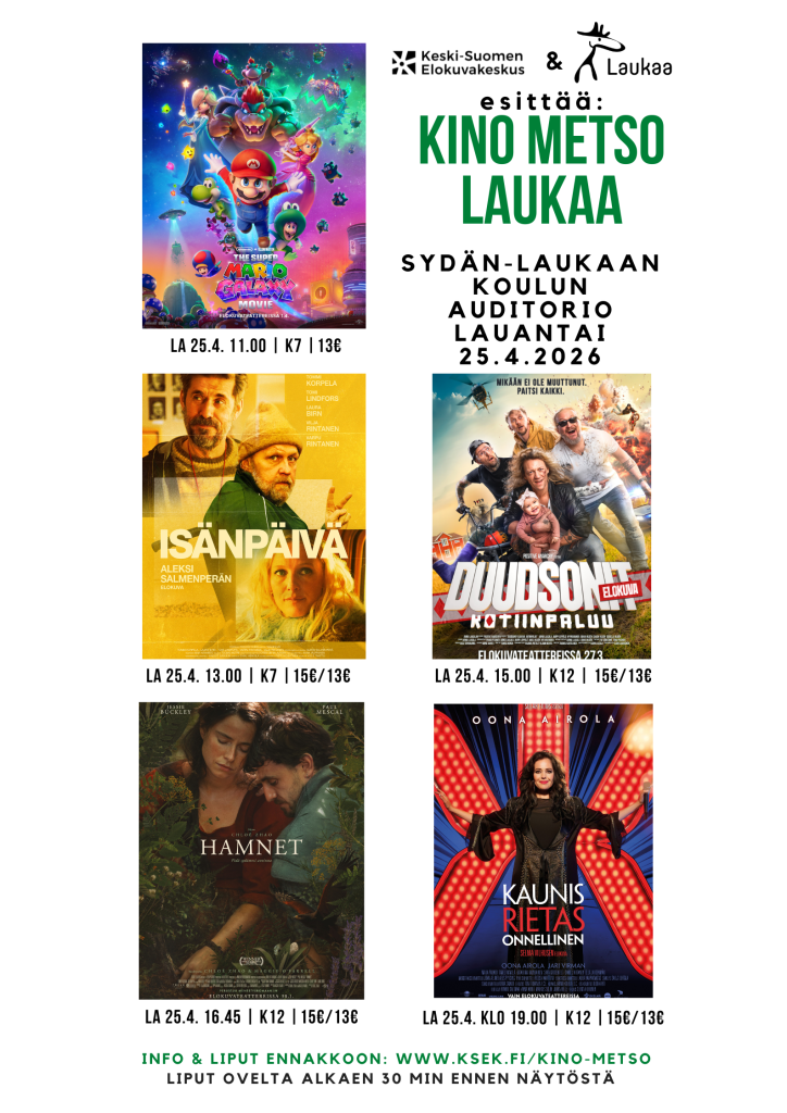 Kevään iloksi Laukaassa on jälleen mahdollisuus päästä nauttimaan huippuelokuvista, kun Keski-Suomen elokuvakeskus ja Kino Metso valloittavat Sydän Laukaan koulun! Elokuvista pääsee nauttimaan Sydärin auditorioon, jossa leffoja pääsee katselemaan pehmeistä penkeistä!